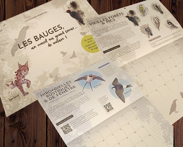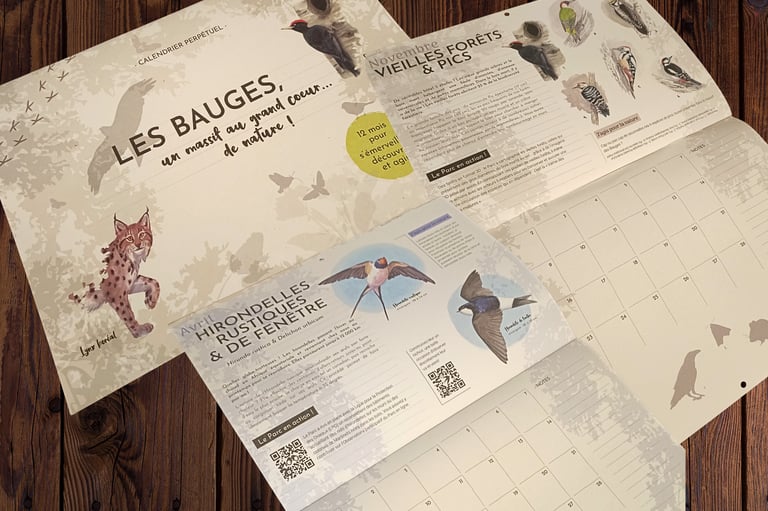 Création des textes d'un calendrier perpétuel faisant apparaitre un panorama des écosystèmes du massif et des zooms sur des espèces remarquables du Parc. Ce projet est réalisé en collaboration avec le Parc naturel régional du Massif des Bauges et Mélanie Dunand, artiste illustratrice naturaliste. La charte graphique et la mise en page ont été réalisées par Marie Darodes.